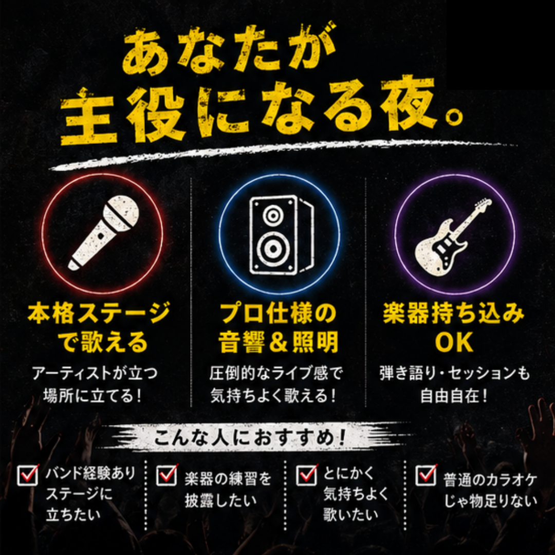 ・本格ステージでカラオケが歌える! ・プロ仕様の音響&照明完備 ・楽器の持ち込み歓迎